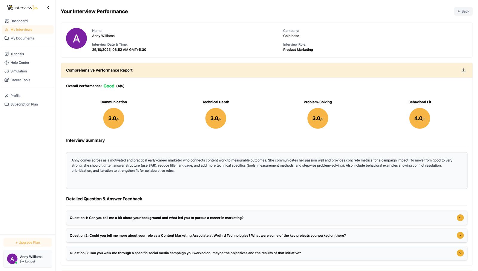 InterviewBee's Mock AI Interviewer does this automatically: upload your CV and JD, and the AI tailors every question and suggested response.