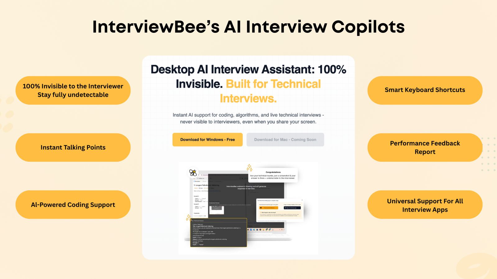 InterviewBee's Desktop AI Assistant offers a stealth mode designed exactly for this. It stays invisible during screen share, even in technical coding rounds.