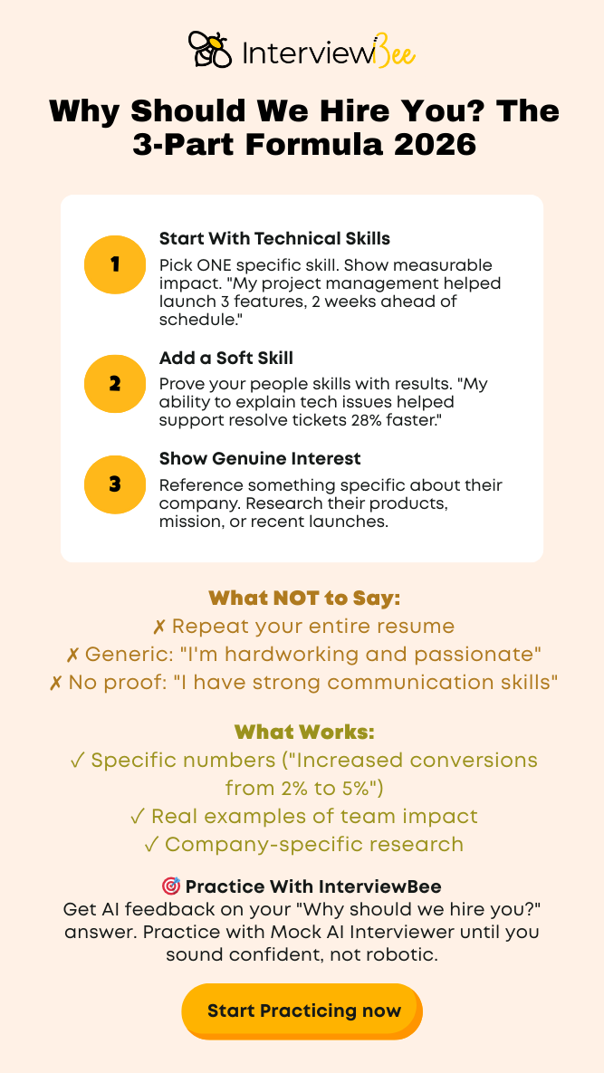 The interview's going great. You've answered every question smoothly. Then the hiring manager asks: "So, why should we hire you?" Most people panic here. They either repeat their entire resume or mumble something generic about being "hardworking." But there's a simpler way to nail this.